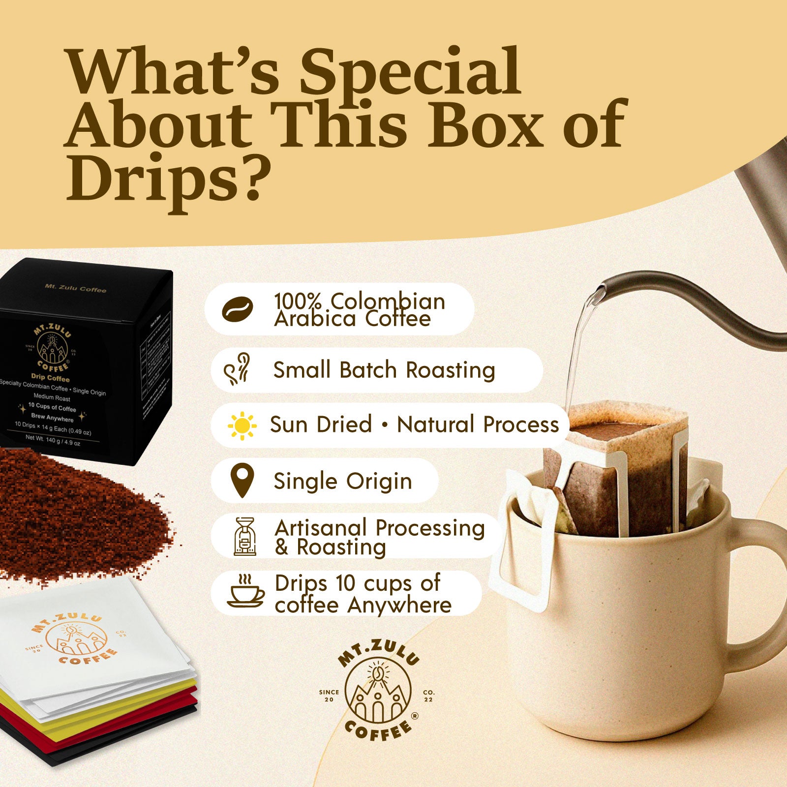 Cada bolsa de goteo prepara una taza de café limpia, aromática y con calidad de cafetería en cualquier lugar: simplemente ábrala, cuelgue el filtro sobre su taza, vierta agua caliente y disfrute de una experiencia de café colombiano verdaderamente elevada.